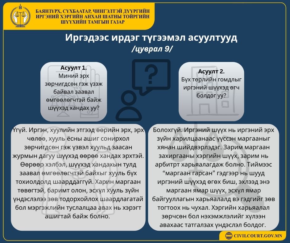 Баянзүрх, Сүхбаатар, Чингэлтэй дүүргийн иргэний хэргийн анхан шатны тойргийн шүүхийн 2026 оны 1-р улирлын шүүн таслах ажиллагааны мэдээ