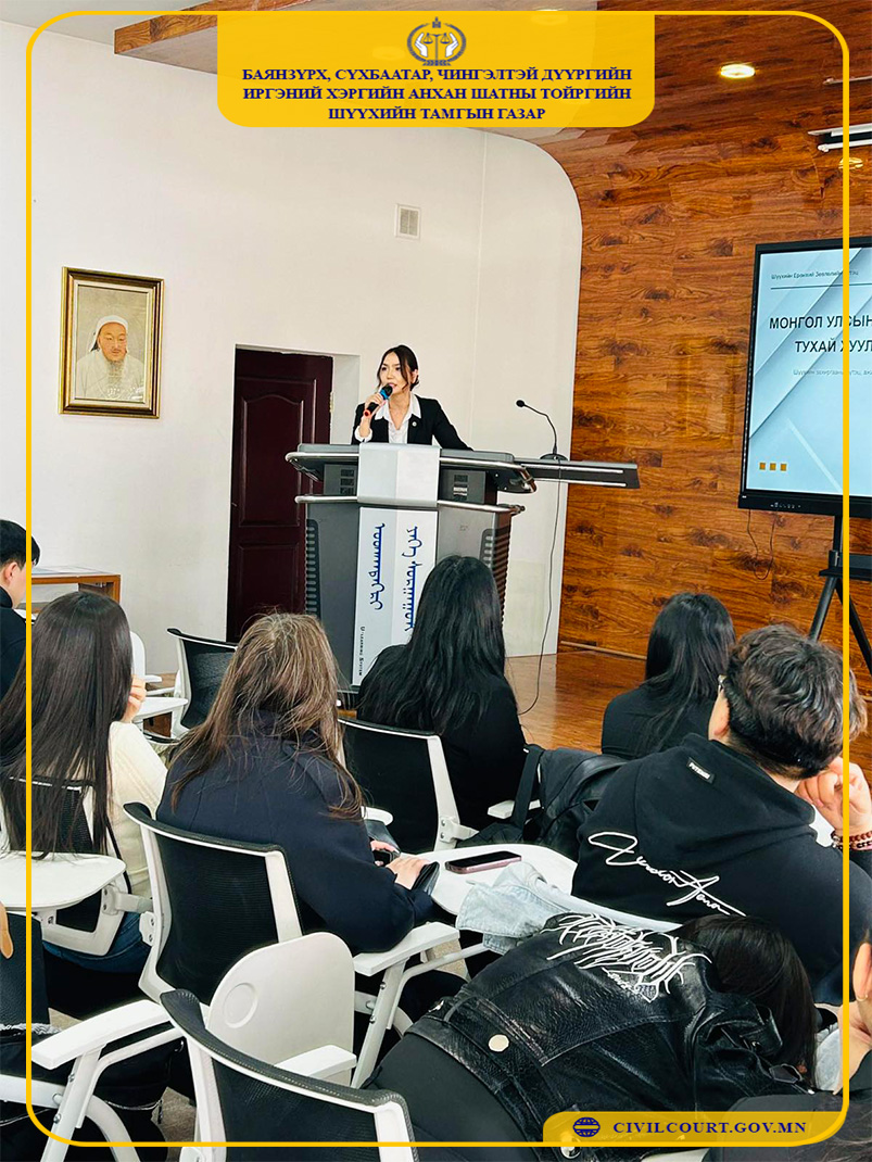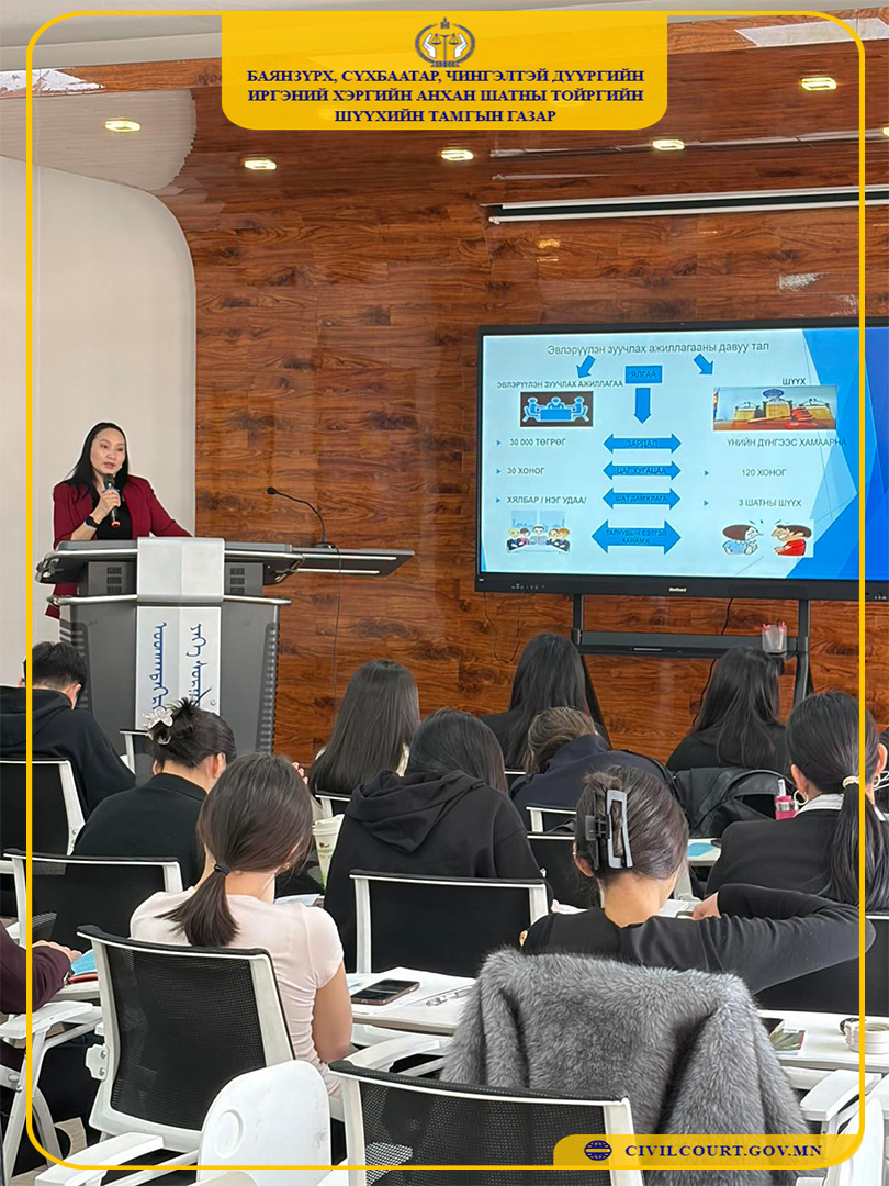 Сургалтаар Монгол Улсын их сургуулийн төгсөх курсийн оюутнуудад эвлэрүүлэн зуучлах ажиллагааны онцлог, давуу тал, хэрэгжилтийн практик туршлагаас хуваалцлаа.