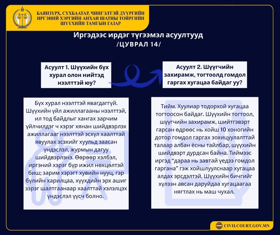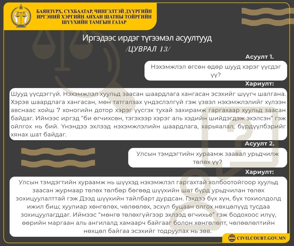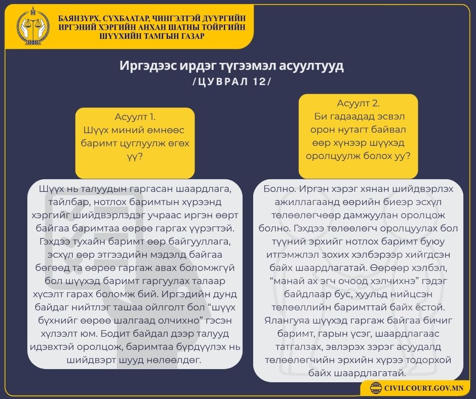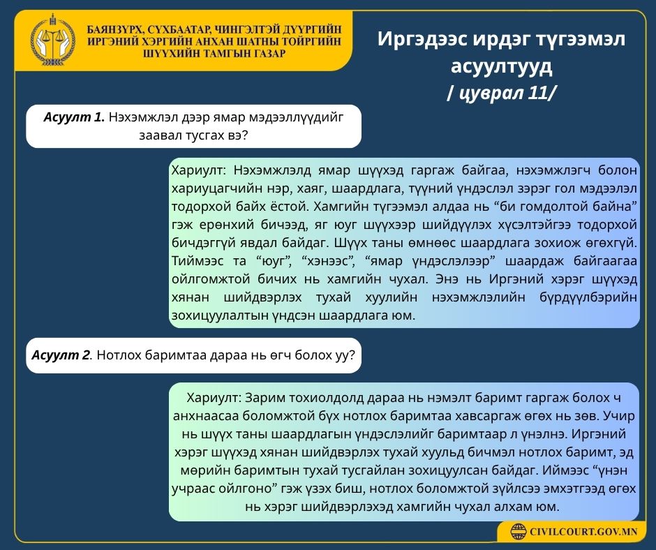 ИРГЭДЭЭС ИРДЭГ ТҮГЭЭМЭЛ АСУУЛТУУД /ЦУВРАЛ 10-15/ 📌 Доорх асуултууд нь иргэдээс хамгийн түгээмэл ирдэг бөгөөд хуульд заасан үндэслэлтэй хариултыг хүргэж байна.