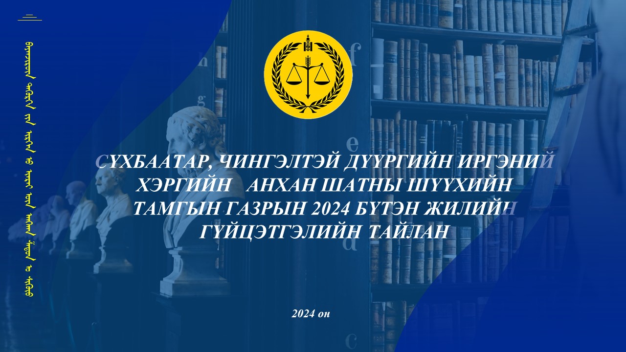 СҮХБААТАР, ЧИНГЭЛТЭЙ ДҮҮРГИЙН ИРГЭНИЙ ХЭРГИЙН АНХАН ШАТНЫ ШҮҮХИЙН ТАМГЫН ГАЗРЫН 2024 ОНЫ ҮЙЛ АЖИЛЛАГААНЫ ТАЙЛАН 2025-01-10 No Comments