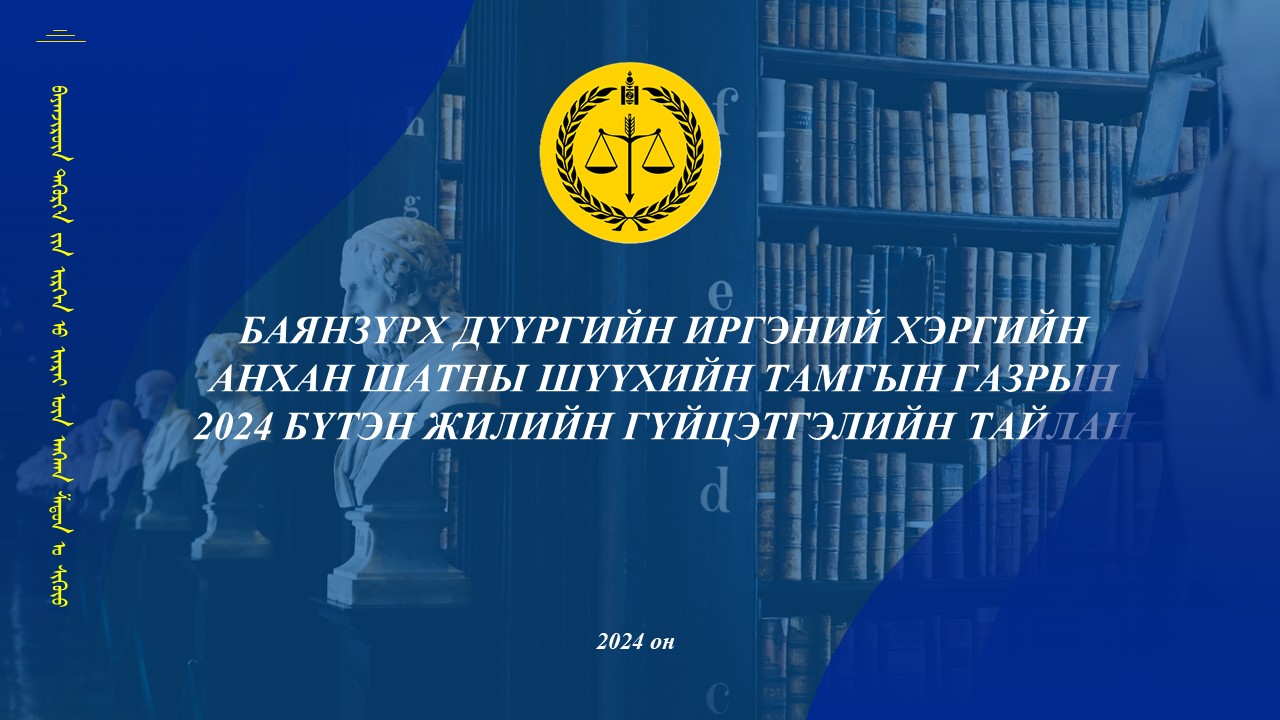 БАЯНЗҮРХ ДҮҮРГИЙН ИРГЭНИЙ ХЭРГИЙН АНХАН ШАТНЫ ШҮҮХИЙН ТАМГЫН ГАЗРЫН 2024 БҮТЭН ЖИЛИЙН ГҮЙЦЭТГЭЛИЙН ТАЙЛАН 2025-01-10 No Comments