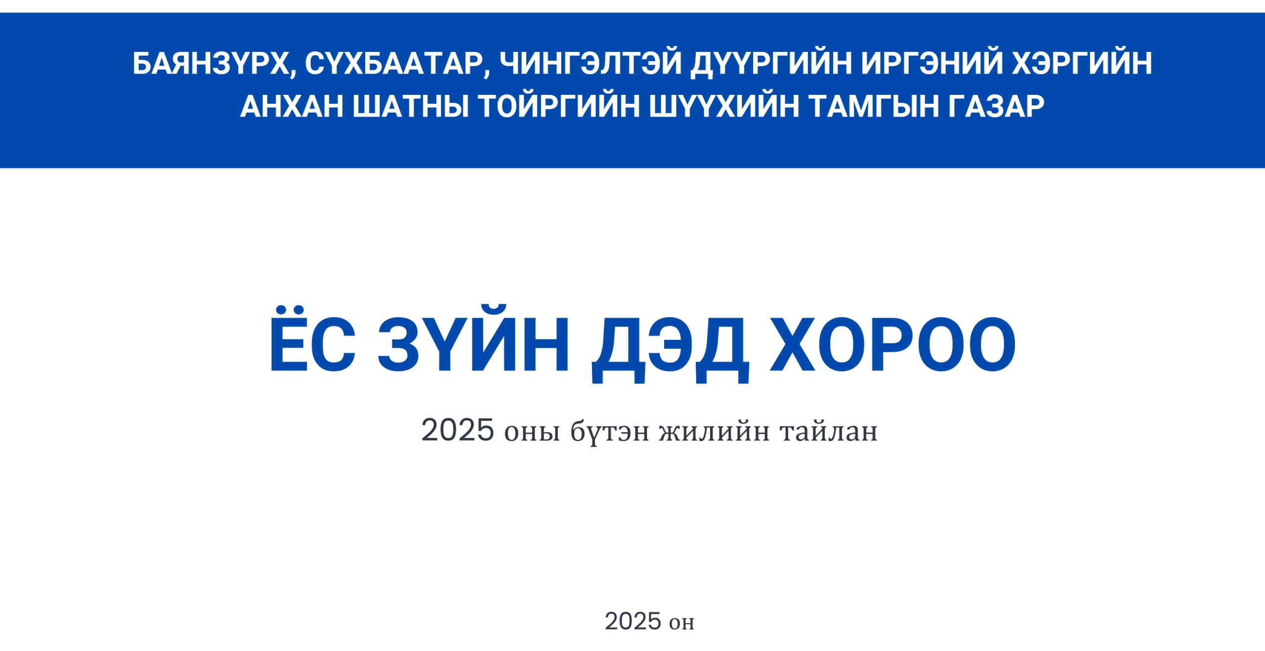 Тайлан 2025 2025-11-24 No Comments Nнновацийн тайлан Шилдэг ажлын тайлан 2025 оны ажлын тайлан Баянзүрх, Сүхбаатар, Чингэлтэй дүүргийн Иргэний хэргийн анхан шатны тойргийн шүүхийн