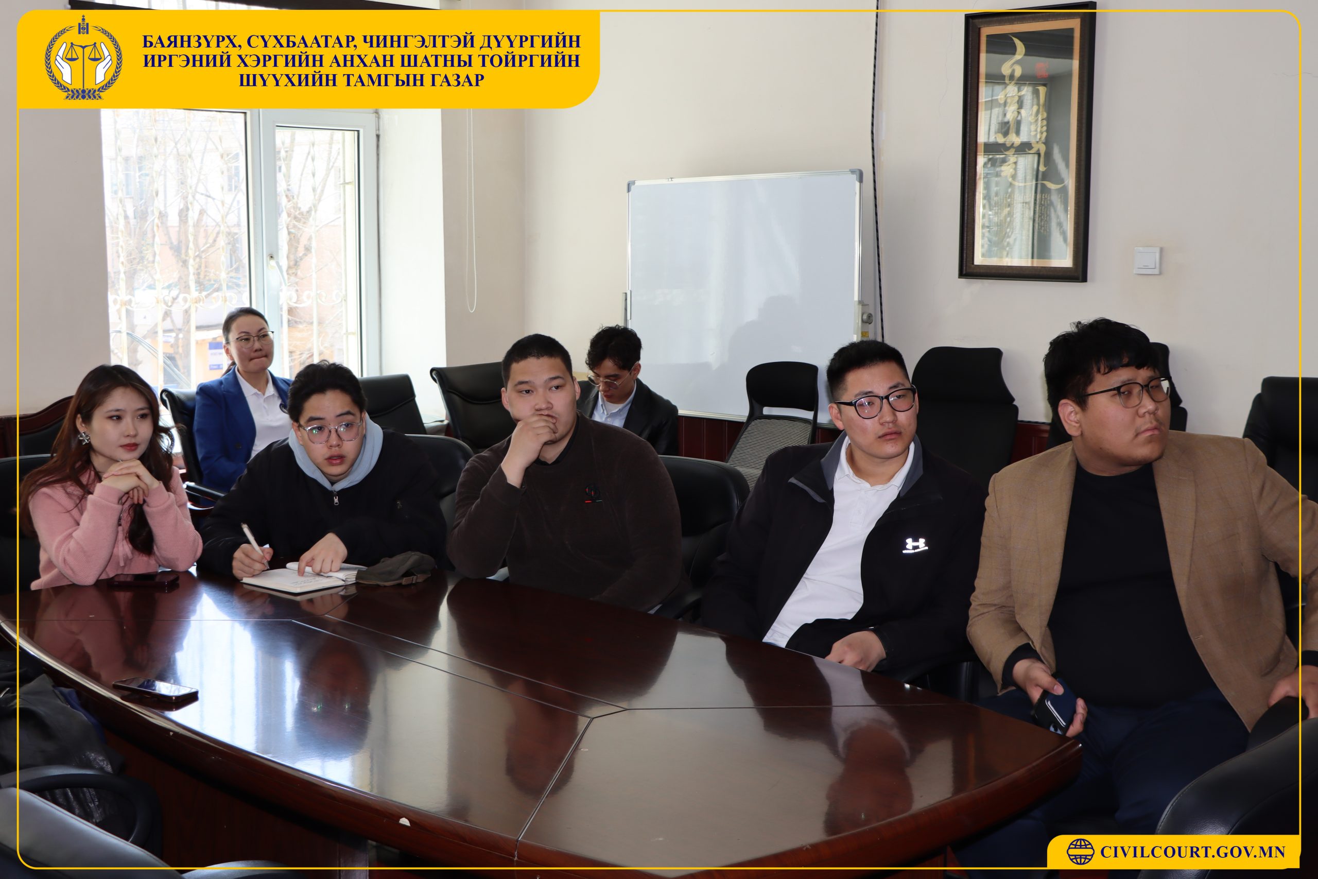 Шүүхийн үйл ажиллагааг олон нийтэд сурталчлан таниулах сургалт зохион байгуулагдлаа 2025-05-06 No Comments 2025 оны 05 дугаар сарын 06-ны өдөр “Шүүхийн тамгын газрын удирдлага, зохион байгуулалт”, “Эвлэрүүлэн зуучлалын тухай ойлголт” сэдвээр