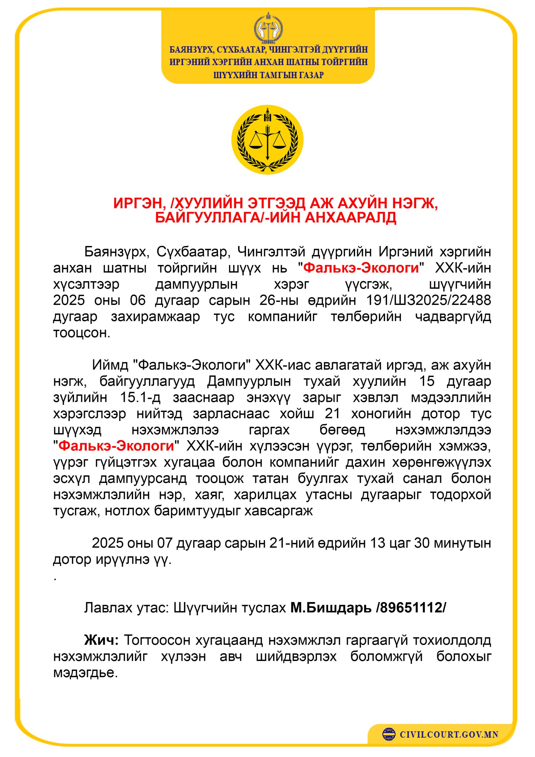 ИРГЭН, /ХУУЛИЙН ЭТГЭЭД АЖ АХУЙН НЭГЖ,БАЙГУУЛЛАГА/-ИЙН АНХААРАЛД 2025-07-04 No Comments Баянзүрх, Сүхбаатар, Чингэлтэй дүүргийн Иргэний хэргийн анхан шатны тойргийн шүүх нь “Фалькэ-Экологи” ХХК-ийн хүсэлтээр
