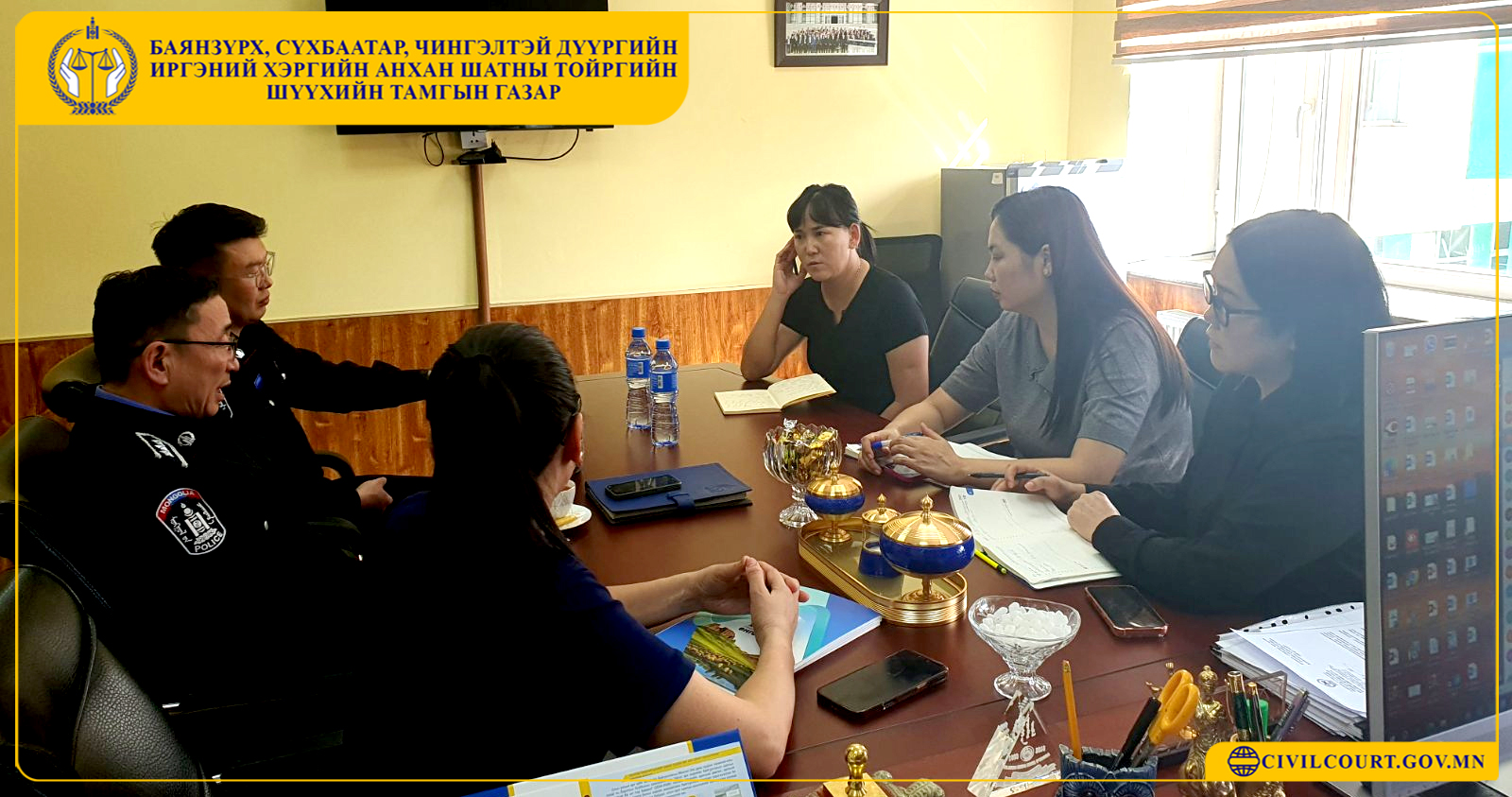 ЭЭЛЖИЛТ УУЛЗАЛТ ЗОХИОН БАЙГУУЛЛАА. 2026-03-24 No Comments Иргэний хэргийн хариуцагчийг албадан ирүүлэх ажиллагааны биелэлт, тулгамдаж буй асуудлын талаар ээлжит уулзалтыг зохион байгууллаа. Тус шүүхийн Тамгын газрын дарга